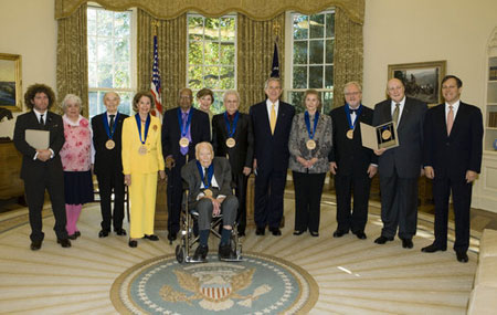 | The President and Mrs. Bush stand in the Oval Office with the recipients of the 2006 National Medal of Arts. Pictured from left are: Ben Jaffe and his mother Sandra Jaffe, director and co-founder of the Preservation Hall Jazz Band; literary translator Gregory Rabassa; dancer Cyd Charisse; photographer Roy DeCarava; industrial designer Viktor Schreckengost; musician Ralph Stanley; arts patron Billie Holladay; composer William Bolcom; Interlochen Center for the Arts CEO Jeffrey Kimpton; and NEA Chairman Dana Goia. photo by Paul Morse |