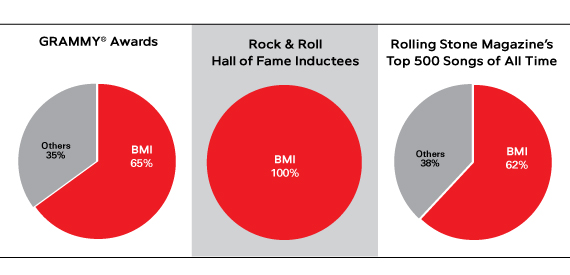 BMI pioneers swept 100% of the 2010 slate of Rock and Roll Hall of Fame inductees: ABBA, Genesis, Jimmy Cliff, The Hollies and The Stooges officially entered rock’s hallowed hall on March 15. The pop culture pulse was also driven by BMI songwriters over the past year: More than 70% of MTV Music Awards went to BMI trendsetters in rock-, urban-, and pop-rooted spheres. Rolling Stone compiled a tongue-wagging list of the top 500 songs of all-time, and BMI songwriters made up more than 60% of the magazine’s multi-genre roll call.