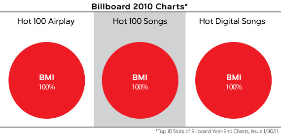 The 2010 Billboard year-end charts also underscore the overwhelming dominance of BMI’s songwriters. Compiled each December and included in a special January issue, the charts reflect the past year’s best performing songs. BMI songwriters wrote or co-wrote 100% of the songs that made up the top ten slots of the Hot 100 Songs, Hot 100 Airplay, and Hot Digital Songs.