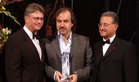 | Top BMI film composer David Arnold collects his Crystal for scoring the film 2 Fast 2 Furious. With him are BMI's Phil Graham and Del Bryant. |
