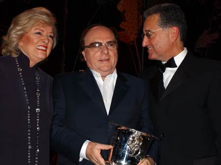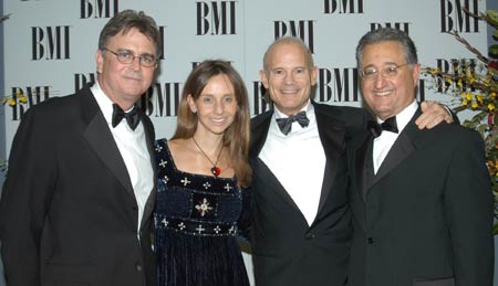 | MTV International Chairman Bill Roedy and Mrs. Roedy are greeted at the BMI London Awards by BMI Senior Vice President of Writer/Publisher Relations Phil Graham (left) and BMI President and CEO Del Bryant. |