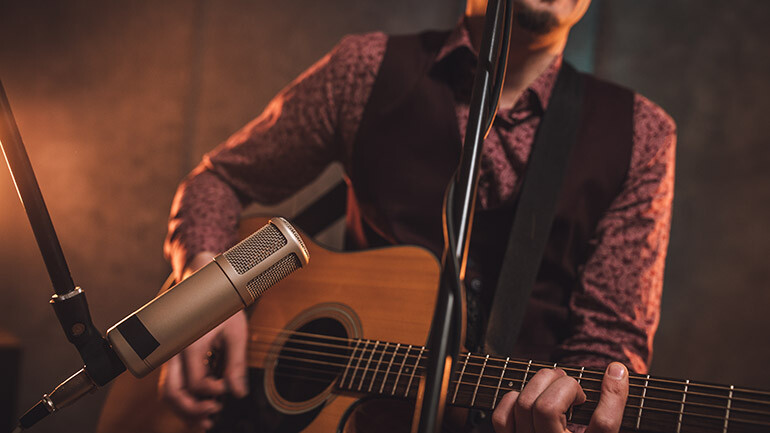 Tracking banjo. With its drum-like top and, on most varieties, closed back that serves as a built-in resonator, the banjo is a loud and percussive instrument, and also one with ample midrange/high end, particularly when played with metal fingerpicks. Your mic choice and placement should take all of that into account, perhaps allowing upwards of two feet between mic and strings to capture equal parts tone and rhythm. While a basic dynamic mic (such as Shure’s SM57 or similar models) will work in a pinch, the rounder, wider pickup range of a large-diaphragm condenser is often the best way to harness the banjo’s potentially abrasive attack, especially when aimed at an angle to the player’s picking hand (i.e., “off-axis”). In fact, some condenser mics have a flatter frequency response than others—the famous AKG C414 being one such model—making them better candidates for recording brighter instruments like banjo (and those mentioned below), if available.