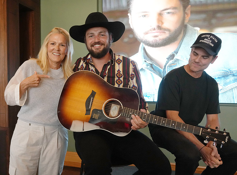 BMI’s Leslie Roberts presents Chayce Beckham with custom Taylor 210e DLX guitar, celebrating his first No. One as a BMI songwriter. Photo: Larry McCormack for BMI.