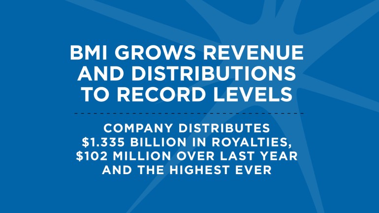 BMI’s total distributions of $1.335 billion include domestic and international royalties as well as distributions from direct deals that BMI administers for its publisher and digital service provider clients. Those direct deals, which make up approximately 6% of BMI’s overall distribution, totaled $85 million, marking a $14 million increase over the previous year.