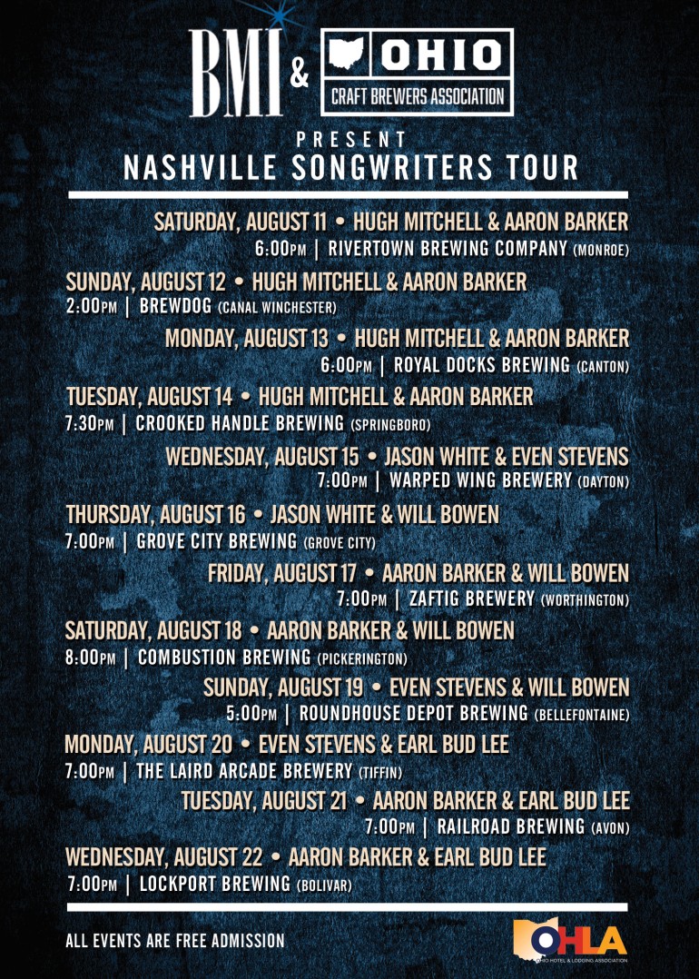 BMI is proud to announce that the Company is partnering with the Ohio Craft Brewers Association (OCBA) to bring great music, great beer and great people together for a special tour of free concerts in Ohio. From Saturday, August 11, through to Wednesday, August 22, BMI’s Nashville Songwriters Tour will crisscross the state, spanning cities from Avon to Dayton and more, while showcasing some of BMI’s top Nashville songwriters.
