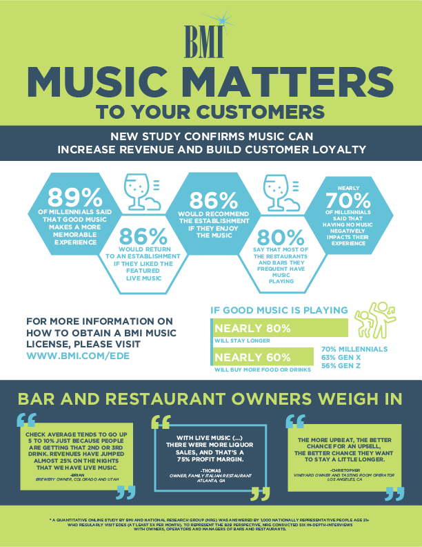 A recent study by BMI and NRG (National Research Group) confirms that music positively impacts the way consumers interact with local eating and drinking establishments. According to the findings, bars and restaurants that feature live music have customers who eat, drink and spend more when listening to music they enjoy, resulting in higher revenues for many business owners.
