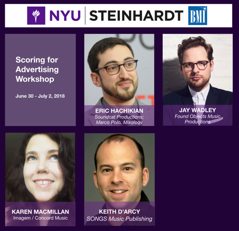Writing for advertising requires the composer to keep calm under the clock, and write creative, effective music in only a few hours. This crash-course workshop is led by the prolific Soundcat Productions founder Eric Hachikian (Marco Polo, When We First Met), and features panelists and presentations from top industry professionals from leading ad agencies such as Keith D’Arcy (SONGS Music Publishing), Karen Macmillan (Imagem/Concord Music), and Jay Wadley (Found Objects Music Productions). In three days, the NYU/BMI Music in Advertising Workshop will teach you how to: