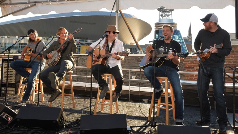 Co-writer Brad Warren, Keith Urban, co-writers Kevin Rudolf and Brett Warren, and producer Nathan Chapman perform on a Nashville rooftop at the “Little Bit of Everything” No. 1 party.