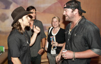 Lee Brice (right) compliments Lukas Nelson (left) on his performance at the Willie Nelson’s Country Throwdown Tour kickoff party. View Photo