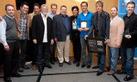 Natalie Lederman, MCHS Editor-in-Chief; BMI’s Hope Lloyd and Joe DiMona; and Best Brief writers Kerry Gabrielson and Daniel Spirn, University of Wisconsin Law School pause for a photo at the 27th annual Cardozo/BMI Entertainment and Communications Law Moot Court Competition. View Photo