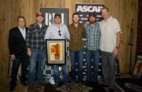 Although the song states, “Grab your shades and your string bikini and your Coppertone 45,” Josh Turner presented the co-writers of “All Over Me” with a flattering substitute at the “All Over Me” #1 party on November 2. Pictured are Ben Hayslip, Dallas Davidson, Rhett Akins, and Josh Turner. View Photo