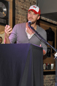 Lady Antebellum’s Charles Kelley thanks the crowd gathered at the Hard Rock Café for the “Our Kind of Love” #1 party on October 6. Pictured are Kelley, Lady Antebellum’s Dave Haywood, co-writer busbee, and Lady Antebellum’s Hillary Scott. View Photo