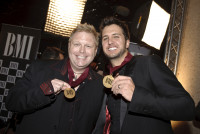 BMI Songwriter of the Year Bobby Pinson & BMI Country Award Winner Luke Bryan show off their medallions on the red carpet at the 2009 BMI Country Awards, held November 10 in Nashville. View Photo