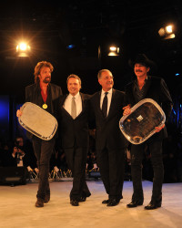 Brooks & Dunn are surprised with the prestigious BMI President’s Award at the 2009 BMI Country Awards, held November 10 in Nashville. Pictured are (l-r): Ronnie Dunn, BMI's Jody Williams, BMI's President & CEO Del Bryant, and Kix Brooks. View Photo