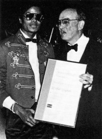 BMI’s Ed Cramer (right) presents the 1983 BMI Pop Songwriter of the Year award to Michael Jackson. View Photo