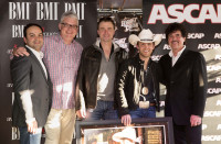 BMI and Music Row well-wishers recently gathered at Nashville’s Honky Tonk Central to celebrate the success of Justin Moore’ No. 1 ballad “Til My Last Day.” The party also honored Moore for two Gold Albums: his eponymous debut and latest Outlaws Like Me. Pictured are (l-r): Big Machine Music’s Mike Molinar, BMI’s Perry Howard, co-writer Jeremy Stover, Justin Moore, and… View Photo