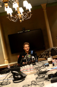 Hunter Hayes fields reporters’ questions at the “Wanted” No. 1 Party at BMI Nashville. View Photo