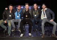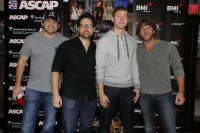 Decked out in CMA Number One Medallions, the writing and performing team behind "Round Here" comes together for a quick photo after presentations ended. Pictured are (l-r): co-writers Rodney Clawson and Chris Tompkins, Florida Georgia Line's Brian Kelley and Tyler Hubbard, and co-writer Thomas Rhett. View Photo