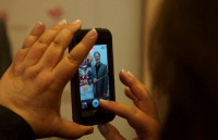 BMI Vice President of Film/TV Relations Doreen Ringer-Ross focuses in on BMI composer Peter Bernstein as he holds his father Elmer Bernstein’s baton. View Photo