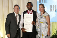 Earnest Pugh hits the stage to receive an award for "I Need Your Glory" during the 2013 BMI Christian Awards, held June 18 in Nashville. Pictured are (l-r): BMI's Jody Williams, Earnest Pugh, and BMI's Leslie Roberts. View Photo
