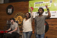 BMI’s Brandon Haas, Samantha Cox, Mike Steinberg and Tim Pattison gather for a photo with Secret Weapons at BMI’s Indie Rock Showcase during SXSW at Trinity Hall at Old School on March 17, 2016, in Austin, TX. View Photo