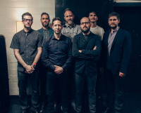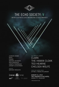 Echo Society members and composers Deru, Rob Simonsen, Jeremy Zuckerman, Nathan Johnson, Joseph Trapanese, Eskmo and Judson Crane pose for a photo at the group’s groundbreaking concert. View Photo