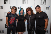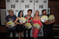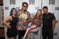 Javier Hiram Gomez and Nabeel Abdulrahman of Vivanativa pose with BMI’s Mary Russe and Joey Mercado before their explosive set at Verano Alternativo at DROM in NYC July 10, 2018 View Photo