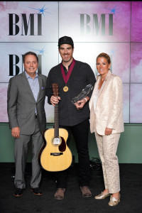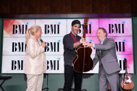 Songwriter of the Year Ed Cash poses onstage with BMI’s Jody Williams and Leslie Roberts. View Photo