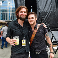 BMI Tailgate performers Colin Elmore and Dan Smalley pose for a photo backstage. View Photo