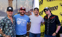 BMI singer-songwriters Levi Hummon, Stephen Wilson, Jr. and Matt Chase and Chris Rogers, of the duo Southerland, take a photo with B100 team-members. View Photo