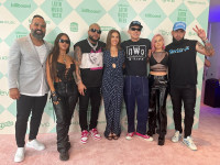 (L-R) BMI’s Jesus Gonzalez, Cris Chil, Dímelo Flow, Leila Cobo, Sky Rompiendo, Kuinvi, and Foreign Teck before the ‘How I Wrote That Song: The Producers’ panel at Billboard Latin Music Week in Miami on Monday, September 26, 2022. View Photo