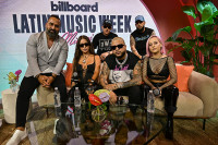 (L-R bottom) BMI’s Jesus Gonzalez, Cris Chil, Dímelo Flow, Kuinvi and (L-R top) Sky Rompiendo and Foreign Teck during the ‘How I Wrote That Song: The Producers’ panel at Billboard Latin Music Week in Miami on Monday, September 26, 2022. View Photo