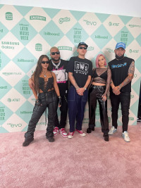 (L-R) ‘How I Wrote That Song: The Producers’ panelists Cris Chil, Dímelo Flow, Sky Rompiendo, Kuinvi, and Foreign Teck pause for a photo at Billboard Latin Music Week in Miami on Monday, September 26, 2022. View Photo