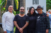 (L-R) Rafael Agustín, BMI’s Jesus Gonzalez and Alex Flores, and co-founder of LALIFF Edward James Olmos at BMI’s “Hora Feliz” event during the Los Angeles Latino International Film Festival (LALIFF) on June 2, 2022, at The Hollywood Roosevelt hotel in Los Angeles, CA. View Photo