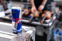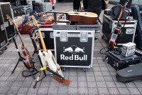 The band enjoys a cold can of Red Bull before performing at BMI’s Rooftop on the Row. View Photo