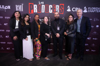 (L-R) BMI’s Alondra Lopez, Beatriz Aguilar, Lyndsey McFail, Maggie Ortiz, Jesus Gonzalez, Lilibeth Patron, and Mike Steinberg gather for a group photo at the 2024 Los Producers benefit concert at M2 Club in Miami, FL on November 13, 2024. View Photo