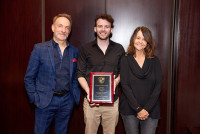 (L-R) BMI composer Mychael Danna, scholarship recipient Alan Catz, and BMI’s Tracy McKnight during BMI Day at Berklee College of Music on October 21, 2024, in Boston, Massachusetts. View Photo