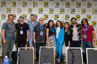 (L-R) White Bear PR’s Chandler Poling, The Newton Brothers, Kevin Kiner, Sean Kiner, Deana Kiner, Alex Seaver, Sherri Chung, and Joy Ngiaw during “The Character of Music: The Art of Scoring for Animation” panel at Comic-Con 2024 at the San Diego Convention Center on Sunday, July 28. View Photo