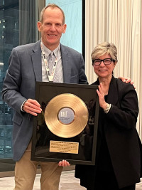 BMI’s Dan Spears presenting retiring RAB CEO Erica Farber with a BMI gold record. View Photo