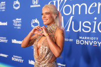 Karol G showing love on the red carpet at Billboard’s Women In Music Awards on March 6, 2024, where she was honored as Women of the Year. View Photo