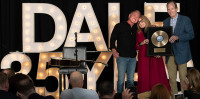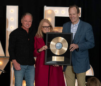BMI’s Dan Spears and BMI songwriter Tim James presenting Rhode Hospitality Association CEO Dale Venturini with a BMI gold record at her retirement party held recently in Providence. View Photo