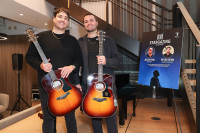 BMI co-writers Peter Fenn and Jesse Fink hold gifted Taylor guitars at their BMI #1 Party for “Stargazing” at BMI LA in Beverly Hills, CA on May 15, 2025. View Photo