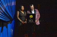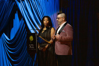 Dara Taylor and Christopher Lennertz presenting an award at the 2025 SCL Awards at the Skirball Cultural Center in Los Angeles. View Photo