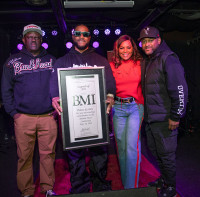 BMI’s Catherine Brewton and BMI’s Byron Wright (right) present Polow da Don (center left) with a BMI Legends of ATL award on stage at BMI Know Them Now X Berklee Ones to Watch at Vinyl at Center Stage in Atlanta, GA on January 15, 2026. View Photo