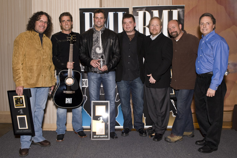 Pictured at the party celebrating Montgomery Gentry’s no. 1 hit “Roll with Me” are producer Blake Chancey, BMI songwriter Clint Daniels, Montgomery Gentry’s Troy Gentry, co-writer Tommy Karlas, Sony ATV’s Troy Tomlinson, Columbia Records Nashville’s Jimmy Rector, and BMI’s Jody Williams. (Photo by Erika Goldring)