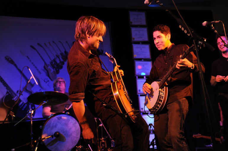 Keith Urban engages in a friendly battle of the strings with multi-instrumentalist Chris Rodriguez at the BMI event celebrating several of Urban’s career milestones. (Photo by John Russell)
