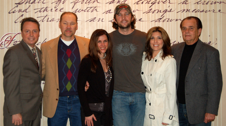 BMI songwriter Brandon Kinney recently inked a co-publishing deal with Tom-Leis Music and Stone Village Music. Kinney co-penned Randy Houser’s current chart-climber, “Boots On,” but has also written songs recorded by Willie Nelson, Lonestar, and Randy Travis. Pictured are BMI’s Jody Williams, Stone Village Music’s Kerry Kurt Phillips and Ronna Reeves, and Brandon Kinney, with Tom-Leis Music’s Leslie DiPiero and Bubba Tomlinson. (Photo by Martina Hamlin)