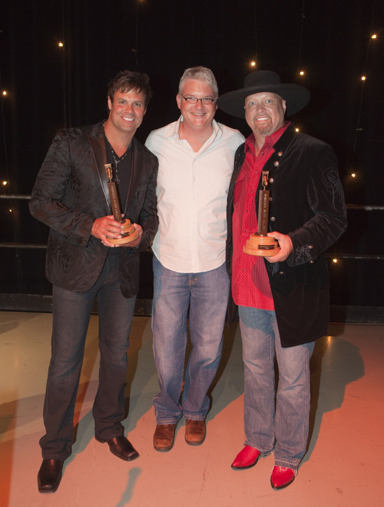 Montgomery Gentry recently reached a glittering career milestone: They were inducted into the Grand Ole Opry. In addition to performing their hits “My Town” and “Something to Be Proud Of” as new members of the legendary club, the duo concluded the emotional evening by singing “Hillbilly Shoes” with Little Jimmy Dickens and Marty Stuart. Pictured at the Opry are Troy Gentry, BMI’s Perry Howard and Eddie Montgomery. (Photo by Chris Hollo)