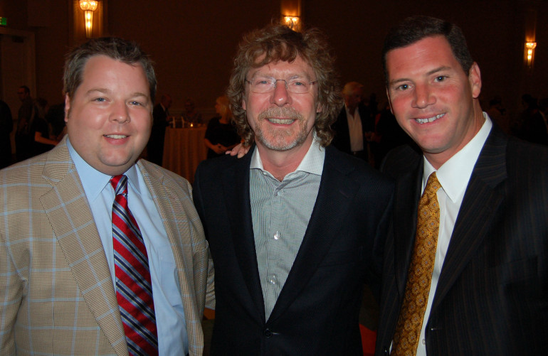 BMI’s Bradley Collins (left) and Mark Mason (right) greet Sam Bush at IBMA Awards Nominees Press Reception, presented by BMI and the IBMA. (Photo by Drew Maynard)