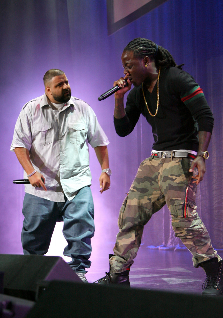 DJ Khaled (L) and Rapper Ace Hood perform onstage during the 11th Annual BMI Urban Awards held at the Pantages Theatre on August 26, 2011 in Hollywood, California. (Photo by Maury Phillips/WireImage)